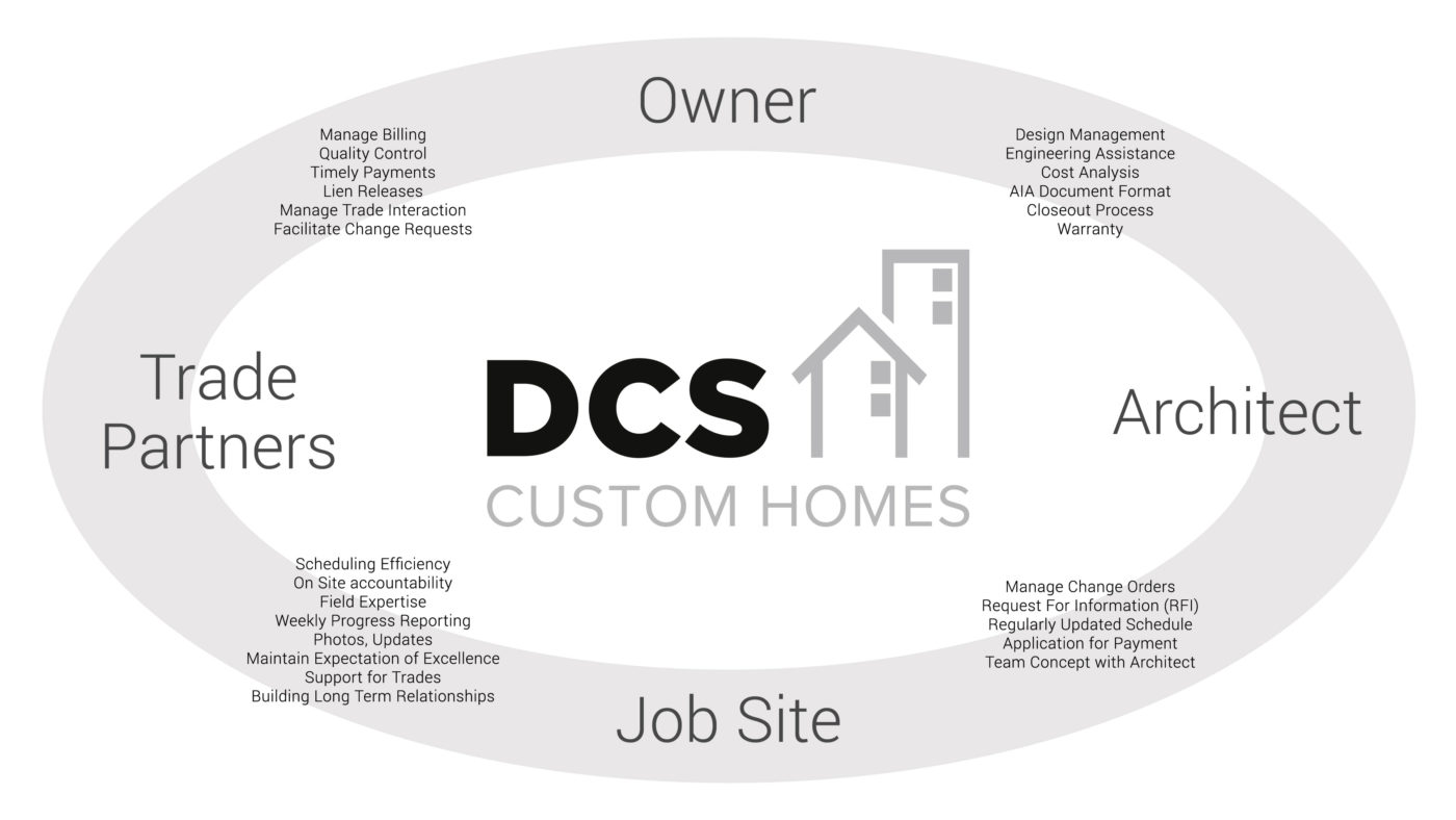The chart below outlines the different relationships that need to be managed, and how DCS works in between each part: Owner, Architect, Trades and the Job Site.